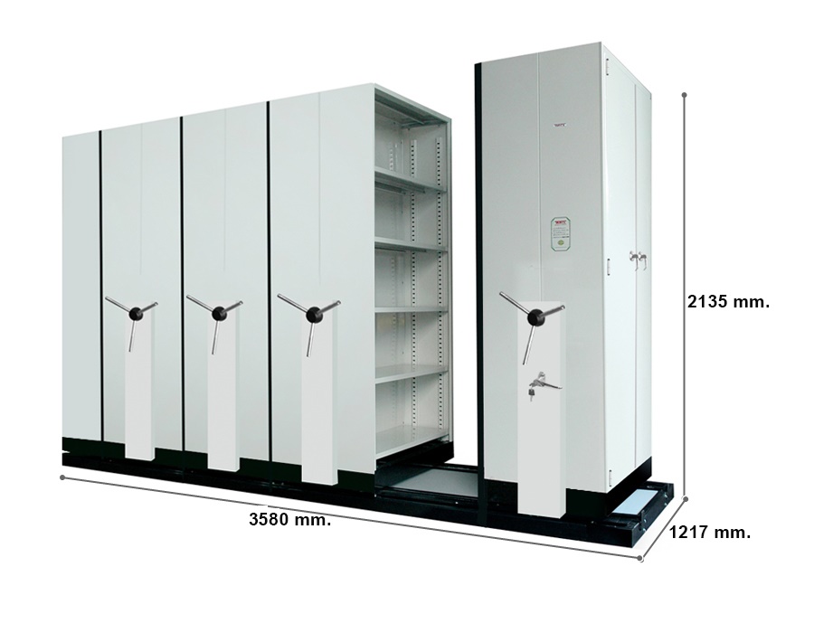 โครงตู้ผลิตจากเหล็ก SPCC หนา 0.7 มม. ฐานล้อและฐานตู้ผลิตจากเหล็กหนา 2 มม. พับรูปตัวยู แผ่นชั้นทำจากเหล็กหนา 0.7 มม. ภายในตู้มีแผ่นชั้นปรับระดับได้ 5 แผ่น/ตู้ ใส่แฟ้มตั้งได้ 5 ชั้น/ตู้ จัดวางแฟ้มขนาด 3 นิ้ว ได้ 15 แฟ้ม/ชั้น ใส่แฟ้มได้ทั้งหมดประมาณ 675 แฟ้ม/ชุด โครงตู้ทั้งหมดผ่านการทำความสะอาดและเคลือบผิวเพื่อป้องกันสนิม มือจับแบบพวงมาลัยหมุน 3 แฉก ทำจากท่อสแตนเลสเส้นผ่าศูนย์กลาง 19 มม. มีระบบทดกำลังเพื่อผ่อนแรงขณะขับเคลื่อนผ่านระบบโซ่ที่มือหมุน ช่วยให้ขับเคลื่อนตู้ได้ง่ายขึ้น