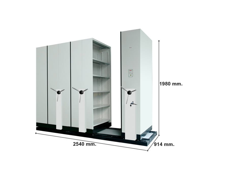 โครงตู้ผลิตจากเหล็ก SPCC หนา 0.7 มม. ฐานล้อและฐานตู้ผลิตจากเหล็กหนา 2 มม. พับรูปตัวยู แผ่นชั้นทำจากเหล็กหนา 0.7 มม. ภายในตู้มีแผ่นชั้นปรับระดับได้ 4 แผ่น/ตู้ ใส่แฟ้มตั้งได้ 4 ชั้น/ตู้ จัดวางแฟ้มขนาด 3 นิ้ว ได้ 11 แฟ้ม/ชั้น ใส่แฟ้มได้ทั้งหมดประมาณ 264 แฟ้ม/ชุด โครงตู้ทั้งหมดผ่านการทำความสะอาดและเคลือบผิวเพื่อป้องกันสนิม มือจับแบบพวงมาลัยหมุน 3 แฉก ทำจากท่อสแตนเลสเส้นผ่าศูนย์กลาง 19 มม. มีระบบทดกำลังเพื่อผ่อนแรงขณะขับเคลื่อนผ่านระบบโซ่ที่มือหมุน ช่วยให้ขับเคลื่อนตู้ได้ง่ายขึ้น