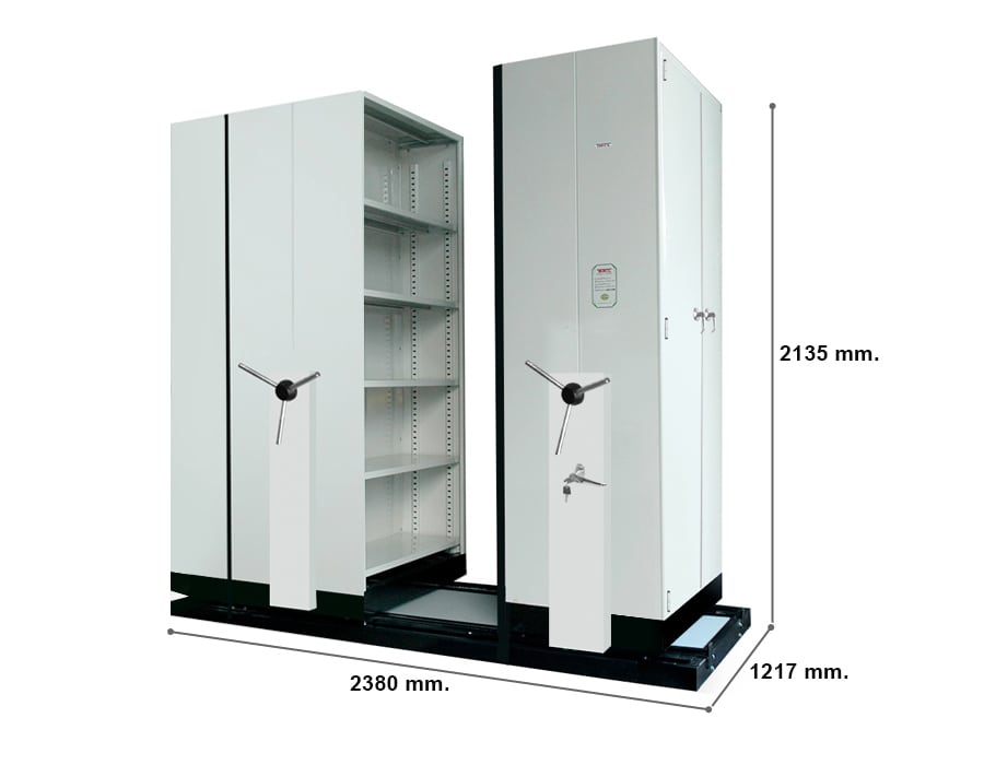 โครงตู้ผลิตจากเหล็ก SPCC หนา 0.7 มม. ฐานล้อและฐานตู้ผลิตจากเหล็กหนา 2 มม. พับรูปตัวยู แผ่นชั้นทำจากเหล็กหนา 0.7 มม. ภายในตู้มีแผ่นชั้นปรับระดับได้ 5 แผ่น/ตู้ ใส่แฟ้มตั้งได้ 5 ชั้น/ตู้ จัดวางแฟ้มขนาด 3 นิ้ว ได้ 15 แฟ้ม/ชั้น ใส่แฟ้มได้ทั้งหมดประมาณ 375 แฟ้ม/ชุด โครงตู้ทั้งหมดผ่านการทำความสะอาดและเคลือบผิวเพื่อป้องกันสนิม มือจับแบบพวงมาลัยหมุน 3 แฉก ทำจากท่อสแตนเลสเส้นผ่าศูนย์กลาง 19 มม. มีระบบทดกำลังเพื่อผ่อนแรงขณะขับเคลื่อนผ่านระบบโซ่ที่มือหมุน ช่วยให้ขับเคลื่อนตู้ได้ง่ายขึ้น