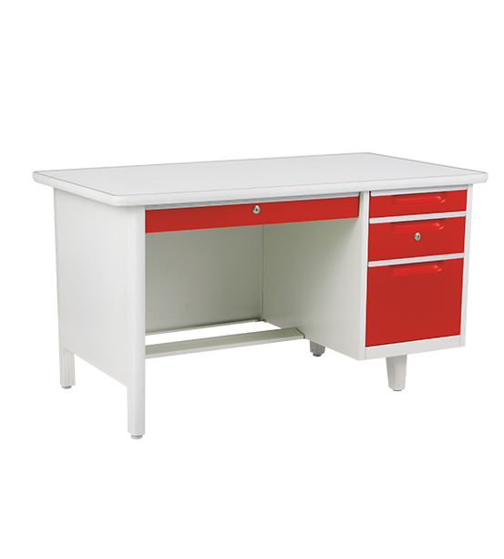 หน้าโต๊ะทำจากเหล็กแผ่นชนิด SPCC เสริมความแข็งแรงด้วย REIN FORCE ทำจากเหล็กแผ่น SPCC ที่ผ่านการขึ้นรูปแบบ ROLL FORM ประกอบและเชื่อมยึด เพื่อความแข็งแรง ผิวหน้าโต๊ะปูด้วย PVC หนา 1.2 มม. ขอบหน้าโต๊ะยึดปิดด้วยขอบยางฉีดขึ้นรูปตลอดแนวพร้อมทั้งมีขอบปิดอลูมิเนียมกันขอบด้านบนหน้าโต๊ะ ลิ้นชักกลางทำจากเหล็กแผ่น SPCC เลื่อนเข้าออกด้วยรางลิ้นชักระบบลูกล้อพลาสติก พร้อมกุญแจล็อค 1 ชุด ขอบมือจับหน้าลิ้นชักยึดติดขอบอลูมิเนียมอย่างดีเพื่อความแข็งแรง ตัวถังลิ้นชักข้าง ทำจากเหล็กแผ่นชนิด SPCC เลื่อนเข้าออกด้วยรางลิ้นชักระบบลูกล้อพลาสติก พร้อมกุญแจล็อค 1 ชุด โดยล็อคแบบ CENTRAL LOCK ในลิ้นชักบนมีถาดใส่เครื่องเขียนทำจากพลาสติดฉีดขึ้นรูป ขอบมือจับหน้าลิ้นชักยึดติดขอบอลูมิเนียมอย่างดีเพื่อความแข็งแรง และสวยงาม