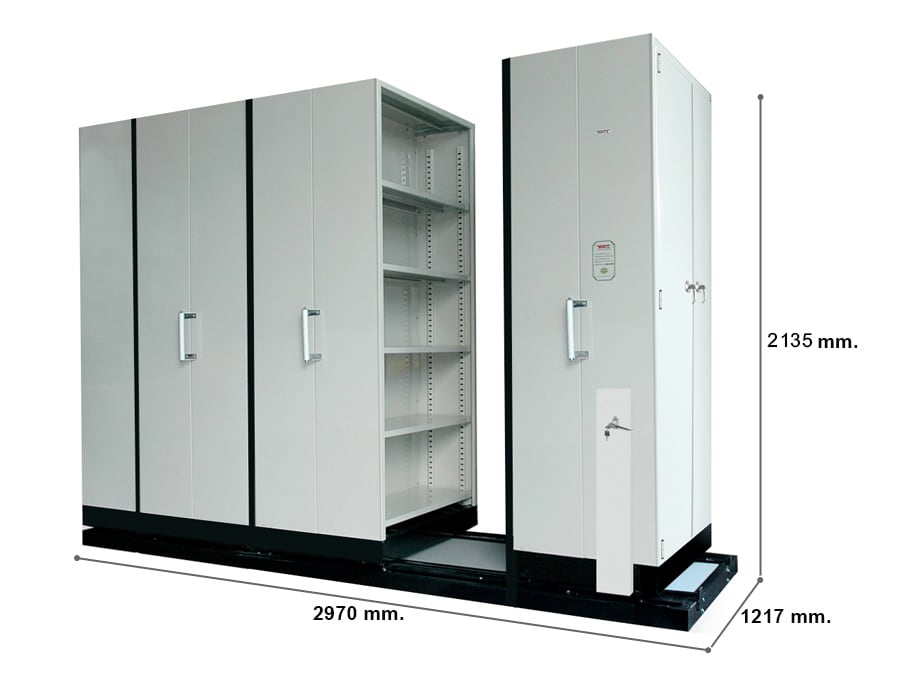 โครงตู้ผลิตจากเหล็ก SPCC หนา 0.7 มม. ฐานล้อและฐานตู้ผลิตจากเหล็กหนา 2 มม. พับรูปตัวยู แผ่นชั้นทำจากเหล็กหนา 0.7 มม. ภายในตู้มีแผ่นชั้นปรับระดับได้ 5 แผ่น/ตู้ ใส่แฟ้มตั้งได้ 5 ชั้น/ตู้ จัดวางแฟ้มขนาด 3 นิ้ว ได้ 15 แฟ้ม/ชั้น ใส่แฟ้มได้ทั้งหมดประมาณ 525 แฟ้ม/ชุด โครงตู้ทั้งหมดผ่านการทำความสะอาดและเคลือบผิวเพื่อป้องกันสนิม มือจับแบบผลัก ทำจากอลูมิเนียมกลมลายเส้นผ่าศูนย์กลาง 1 นิ้ว แผ่นยึดมือผลัก ทำจากเหล็กหนา 2 มม. ชุบโครเมี่ยม